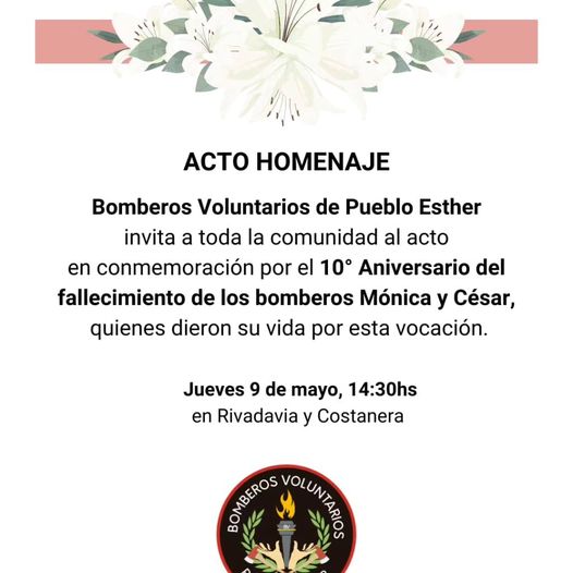Invitamos a familiares, amigos y toda la comunidad al Acto en conmemoración por el 10° Aniversario del fallecimiento de los bomberos Mónica y César que se realizará el día Jueves 09 de mayo a las 14:30hs en Rivadavia y Costanera. Navegación de entradas Alianza para la Seguridad: Coordinación entre Autoridades en Pueblo Esther Felices Cumpleaños, Subcomandante Ayala Luis: ¡Disfruta de un Día Maravilloso!