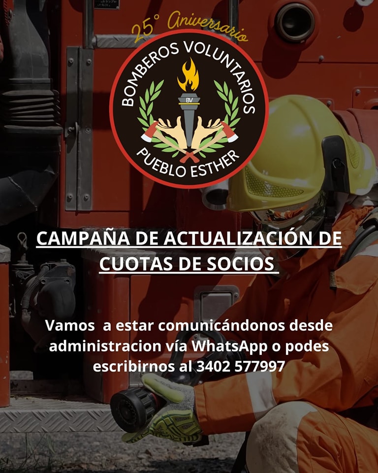 Si todavía no te pusiste al día con tus cuotas, este es el momento perfecto:La cuota será de $1000 por mes pero si pagás por transferencia o débito, la cuota te queda en $800 Cancelá tu cuota ya:ALIAS Mecardo Pago: bomberos.pe.mpALIAS Banco Credicoop: agua.manguera.sirena ¿No sabés cuánto debés? Escribinos al WhatsApp +54 9 3402 57-7997Aprovechá el descuento, aboná todo el año junto ¡y listo! Si todavía no sos socio, ¡este es el momento de sumarte! Con tu aporte ayudás a seguir creciendo y brindando un mejor servicio a nuestra comunidad. Navegación de entradas ¡Feliz Cumpleaños, Yesica Carrera! 🎉 Solidaridad y Apoyo a Nuestros Hermanos de Resistencia Zona Sur.