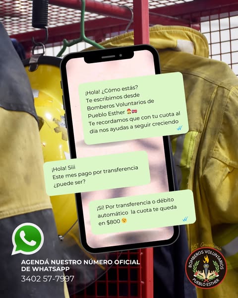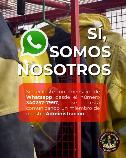 ¡SÍ, SOMOS NOSOTROS! 👩🚒👨🚒 🌟 Tenemos whatsapp: 340257-7997 Si recibís un mensaje de este número, es nuestra administración contactándote para recordarte la regularización de tu cuota. Además, podrás recibir novedades y hacer consultas. 🚨 Importante: No usamos este WhatsApp para emergencias. Si necesitás asistencia, llamanos al 498191. 📌 Agendanos ahora y, si aún no sos socio, ¡este es el mejor momento para sumarte! Tu aporte nos ayuda a seguir creciendo y brindando un mejor servicio a la comunidad.