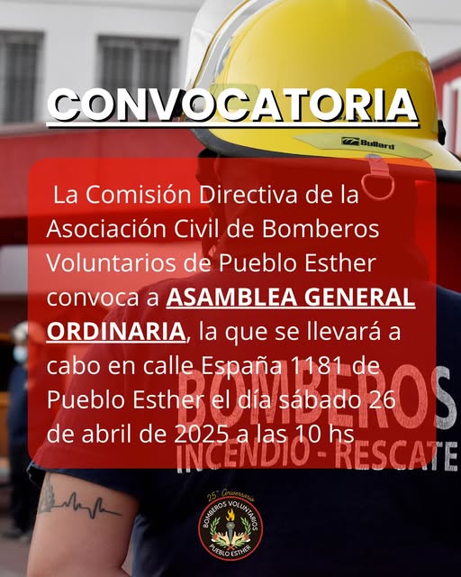 La Comisión Directiva de la Asociación Civil de Bomberos Voluntarios de Pueblo Esther, convoca a asamblea general ordinaria, la que se llevará a cabo en calle España nº 1181 de Pueblo Esther el día 26 de abril de 2025 a las 10 hs para tratar el siguiente orden del dia: