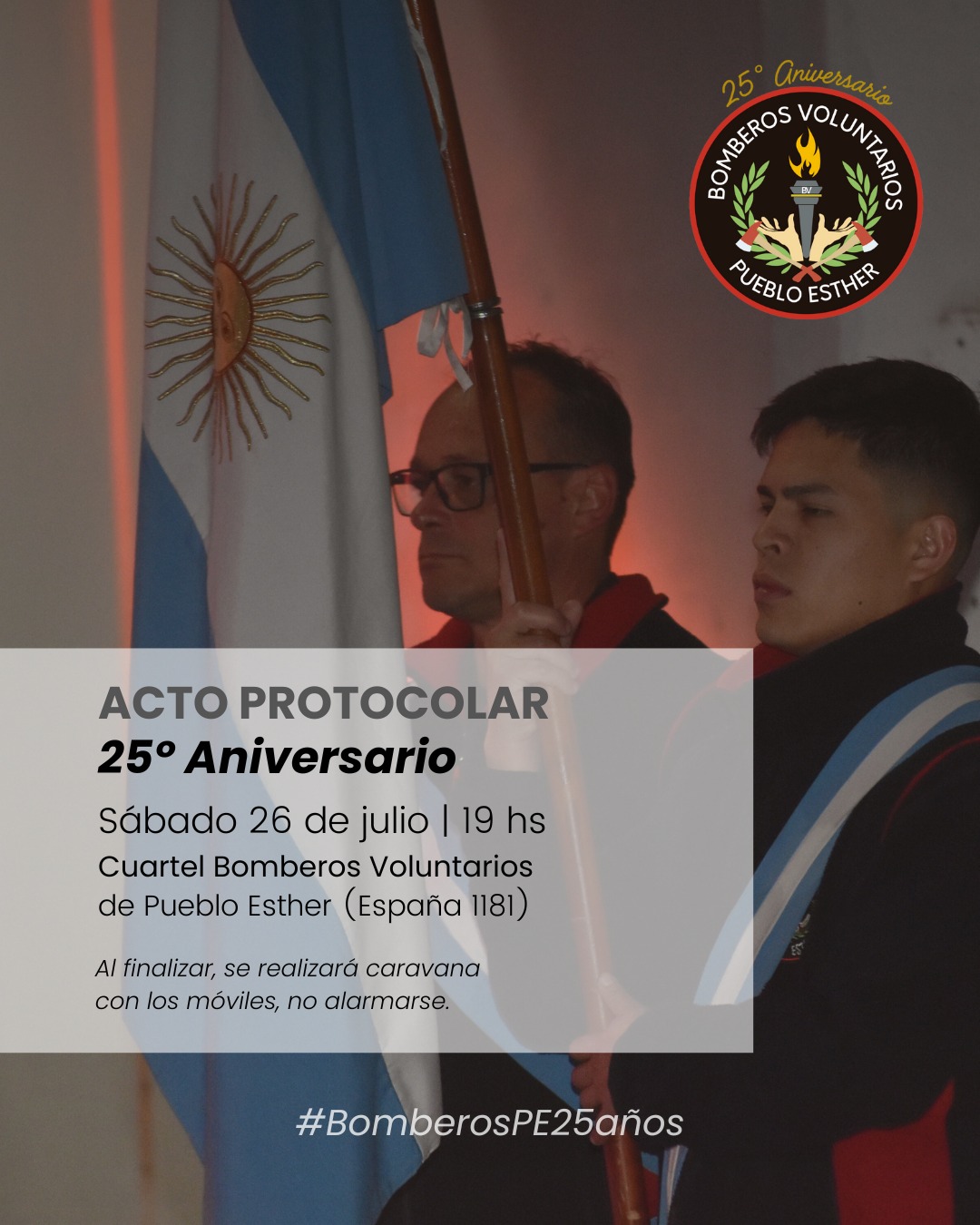 Invitamos a todas y todos a acompañarnos en el Acto Protocolar por el 25º Aniversario de nuestra institución Sábado 26 de juli 19 hs – Cuartel de Bomberos – España 1181¡Los esperamos para compartir este momento tan especial! Navegación de entradas Formación con Fuego y Compromiso: Jornada Regional en Pueblo Esther. 25 Años de Historia, Vocación y Comunidad: Un Acto para el Recuerdo.