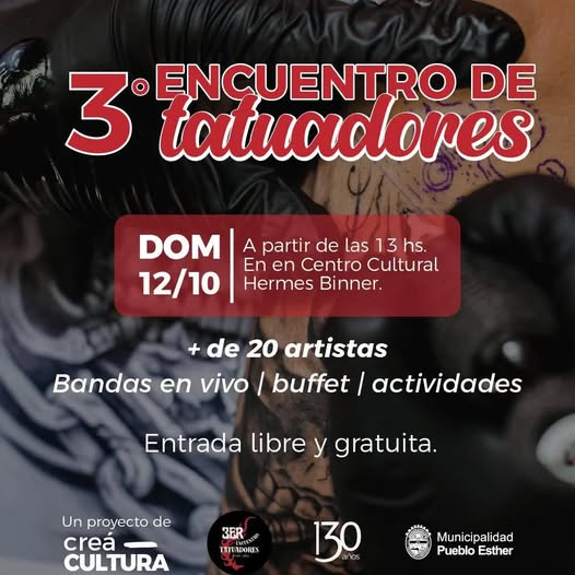 3° Encuentro de Tatuadores de Pueblo Esther Domingo 12 de octubre Desde las 13 hs. Centro Cultural Hermes Binner (España y San Lorenzo) Entrada libre y gratuitaMás de 20 artistas tatuadores se reúnen en un encuentro que se llenará de arte Un espacio para disfrutar, inspirarse y celebrar las diferentes formas de expresión.¡Servicio de buffet a cargo de Bomberos!! Navegación de entradas Celebramos a un líder con corazón: ¡Feliz cumple, Subjefe Gambini! «Prevención con Corazón: Honramos la Lucha, Abrazamos la Vida»