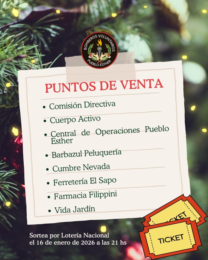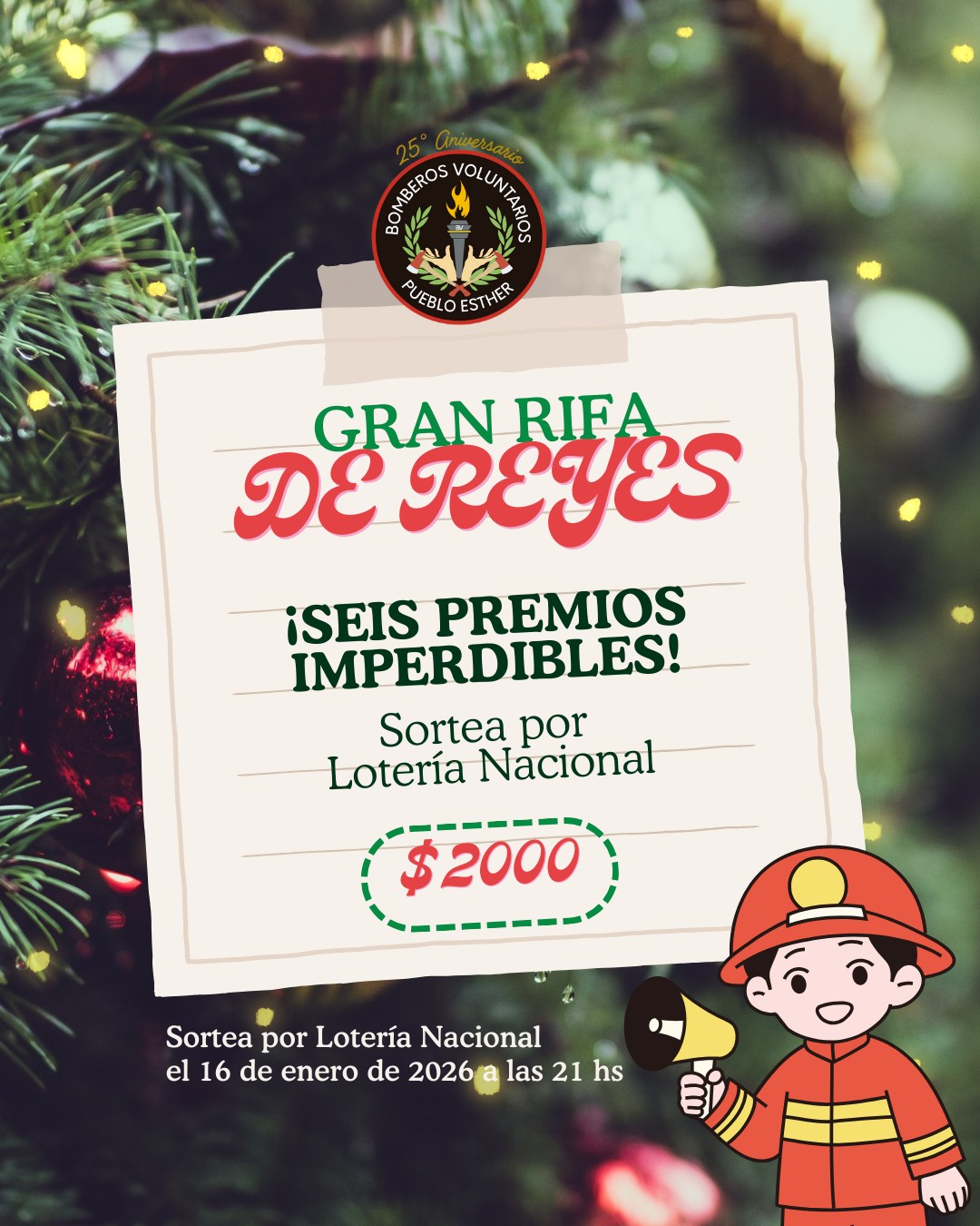 GRAN RIFA DE REYES Con tu colaboración, seguís ayudando a crecer y, además, participás por seis premios imperdibles. Bono contribución de $2.000Sorteo: 16 de enero de 2026 – 21 hsPor Lotería NacionalPREMIOS: Bicicleta R29 marca Avelino Horno eléctrico (donación de Sandra Filippini) Sillón reposera (donación de Vida Jardín) 1 kg de helado (Cumbre Nevada) Voucher de Ferretería El Sapo Corte de pelo (Barbazul Peluquería)PUNTOS DE VENTAS Comisión Directiva Cuerpo Activo Central de OperacionesY TAMBIÉN EN NUESTROS COMERCIOS AMIGOS: Barbazul Peluquería Cumbre Nevada Ferretería El Sapo Farmacia Filippini Vida Jardín Gracias a cada comercio, a cada vecino y vecina que colaboran con nuestra institución. Navegación de entradas “Nuestro abrazo solidario a familia, amigos y compañeros”